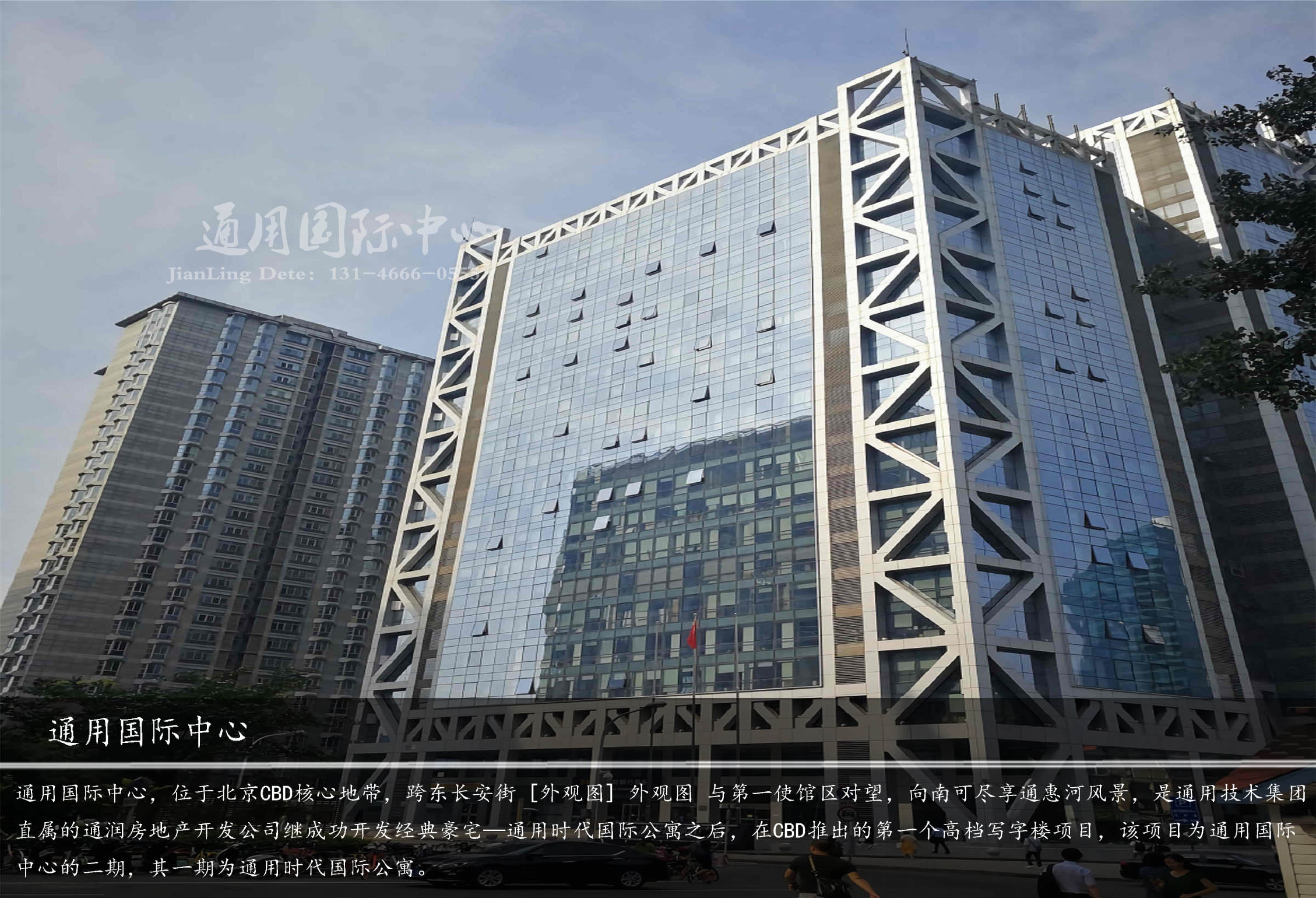 通用國際中心,位于建國門外大街永安東里甲3號,北京CBD核心地帶,跨東長安街與第一使館區(qū)對望,向南可盡享通惠河風景,是通用技術集團直屬的通潤房地產開發(fā)公司繼成功開發(fā)經典豪宅——通用時代國際公寓之后,在CBD推出的第一個高檔寫字樓項目,該項目為通用國際中心的二期,其一期為通用時代國際公寓。北京秉承打造百年建筑的企業(yè)理念,通用國際中心全面采用國際化標準,使用國際上先進的全鋼結構,是繼國貿、京廣中心之后,CBD第三座全鋼結構國際寫字樓。
