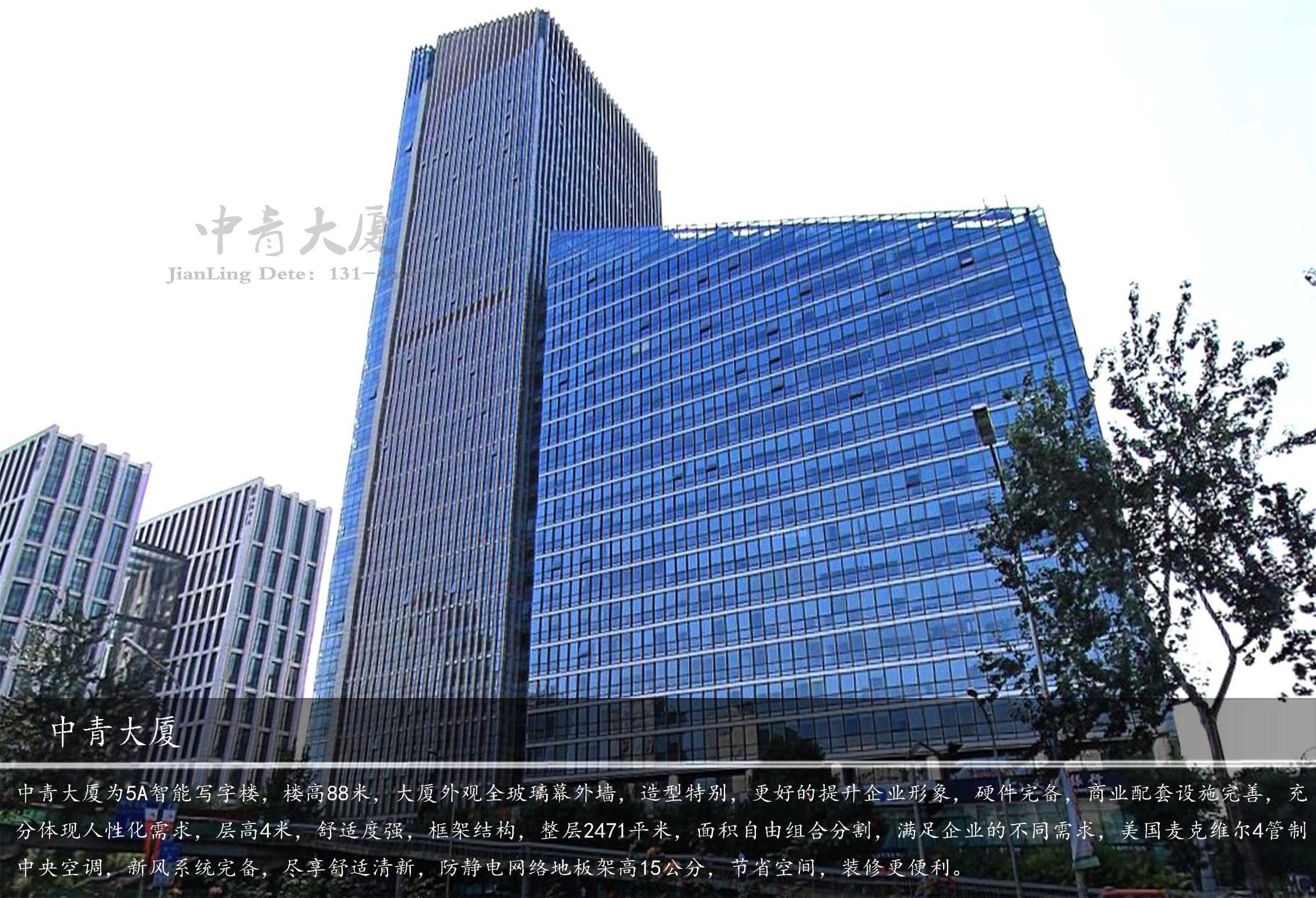 中青大廈為5A智能寫字樓,樓高88米,大廈外觀全玻璃幕外墻,造型特別,更好的提升企業(yè)形象,硬件完備,商業(yè)配套設(shè)施完善,充分體現(xiàn)人性化需求,層高4米,舒適度強,框架結(jié)構(gòu),整層2471平米,面積自由組合分割,滿足企業(yè)的不同需求,美國麥克維爾4管制中央空調(diào),新風系統(tǒng)完備,盡享舒適清新,防靜電網(wǎng)絡(luò)地板架高15公分,節(jié)省空間,裝修更便利。中青大廈被朝陽公園、團結(jié)湖公園環(huán)繞。東三環(huán)長虹橋南, 緊鄰地鐵10號線,東三環(huán)十幾條公交線路直達,交通便利。緊臨東三環(huán)寫字樓主路,西靠三里屯商務(wù)休閑區(qū),南依CBD商務(wù)核心區(qū),北望燕莎使館區(qū),四大商圈交匯的地段,商務(wù)資源豐富,辦公的理想去處。