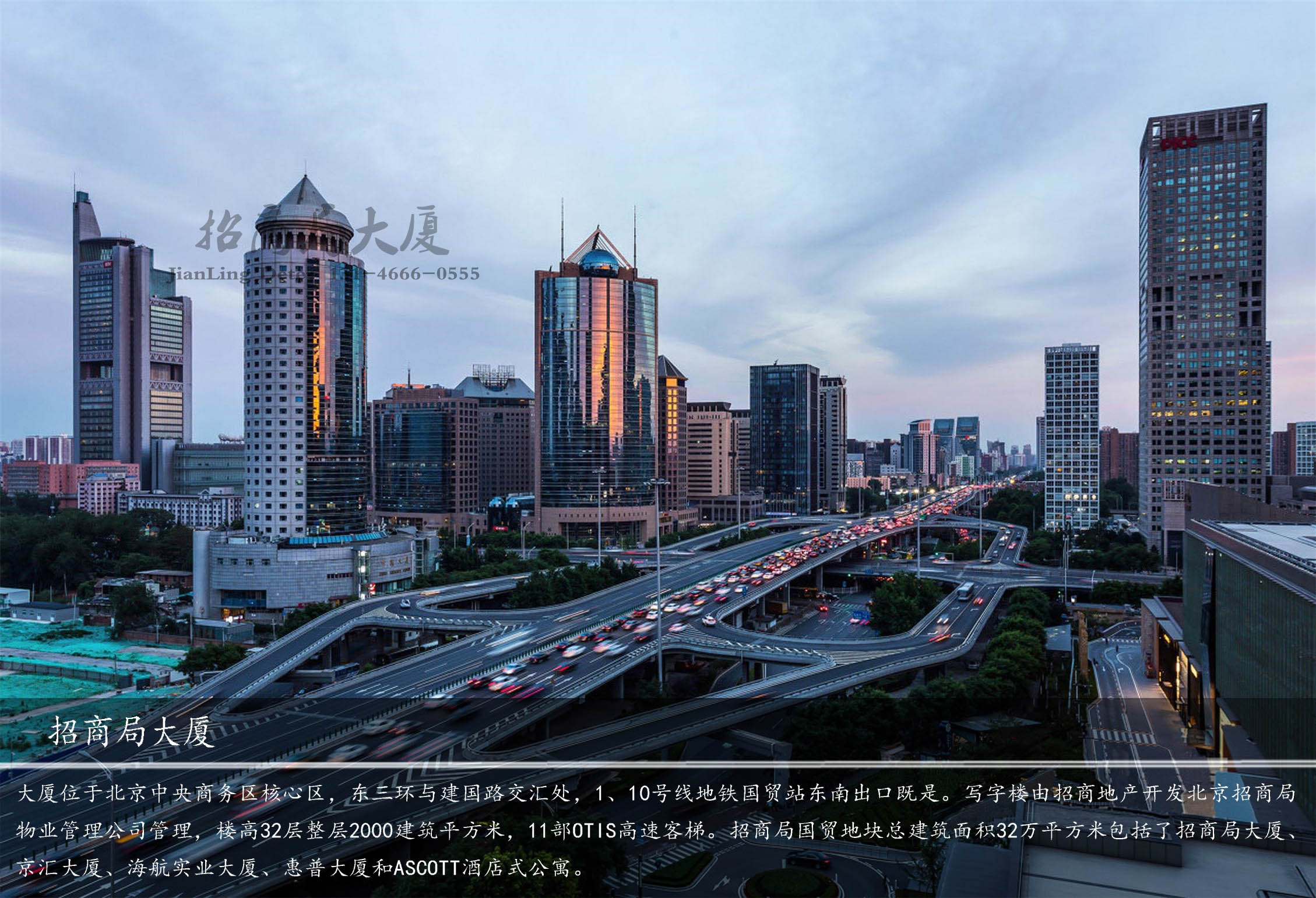大廈位于北京中央商務(wù)區(qū)核心區(qū),東三環(huán)與建國(guó)路交匯處,1、10號(hào)線地鐵國(guó)貿(mào)站東南出口既是。寫字樓由招商地產(chǎn)開發(fā)北京招商局物業(yè)管理公司管理,樓高32層整層2000建筑平方米,11部OTIS高速客梯。招商局國(guó)貿(mào)地塊總建筑面積32萬(wàn)平方米包括了招商局大廈、京匯大廈、海航實(shí)業(yè)大廈、惠普大廈和ASCOTT酒店式公寓。配套設(shè)有招商銀行、工商銀行、建設(shè)銀行、中信銀行、廣發(fā)銀行,潮福城、阿文上海菜、金鼎軒、阿一鮑魚以及星巴克咖啡廳、同仁堂。