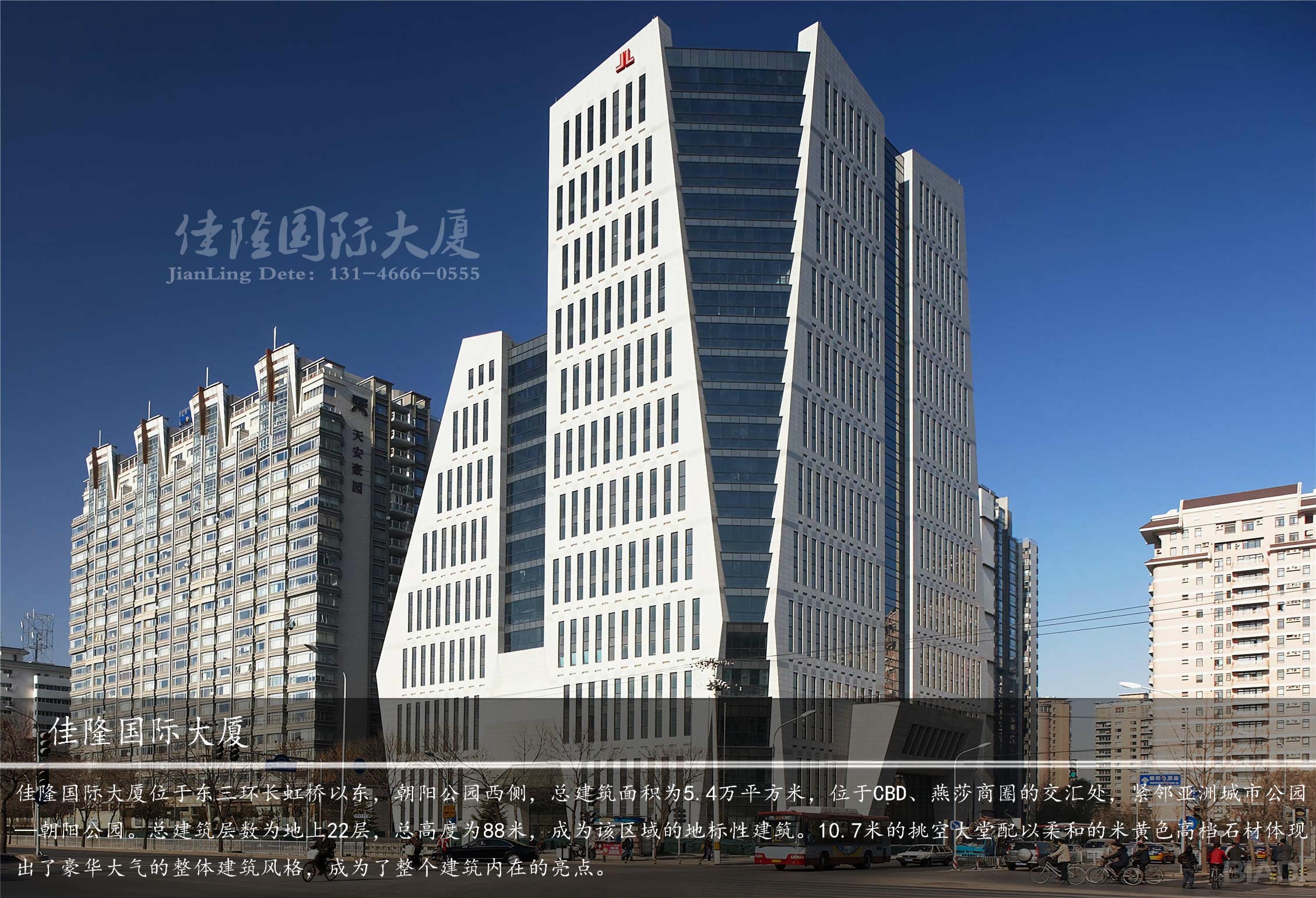 佳隆國(guó)際大廈位于東三環(huán)長(zhǎng)虹橋以東,朝陽(yáng)公園西側(cè),總建筑面積為54,732平方米建筑占地面積5975平方米。位于CBD、燕莎商圈的交匯處,緊鄰亞洲城市公園—朝陽(yáng)公園。總建筑層數(shù)為地上22層,地下3層,總高度為88米,成為該區(qū)域的地標(biāo)性建筑。10.7米的挑空大堂配以柔和的米黃色高檔石材體現(xiàn)出了豪華大氣的整體建筑風(fēng)格,成為了整個(gè)建筑內(nèi)在的亮點(diǎn)。大廈整體設(shè)計(jì)理念始終貫穿了節(jié)能的理念,建筑外立面為玻璃幕墻和高檔石材,所有窗戶均為可開(kāi)啟式,更加便于新鮮空氣的順暢流淌,成為一座“會(huì)呼吸的OFFICE”。銀行、高檔餐飲、健身、SPR、咖啡、員工餐廳等周全配套為大廈整體品質(zhì)增光添色。優(yōu)秀的物業(yè)管理公司秉承著“服務(wù)無(wú)止盡”的服務(wù)理念,為整個(gè)大廈提供酒店及管家式的全方位服務(wù)。