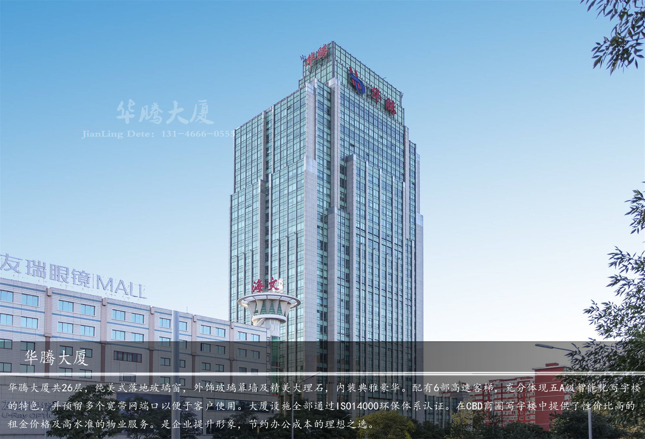 華騰大廈共26層,純美式落地玻璃窗,外飾玻璃幕墻及精美大理石,內(nèi)裝典雅豪華。配有6部高速客梯,充分體現(xiàn)五A級智能化寫字樓的特色,并預(yù)留多個寬帶網(wǎng)端口以便于客戶使用。大廈設(shè)施全部通過ISO14000環(huán)保體系認證。在CBD商圈寫字樓中提供了性價比高的租金價格及高水準的物業(yè)服務(wù)。是企業(yè)提升形象,節(jié)約辦公成本的理想之選。