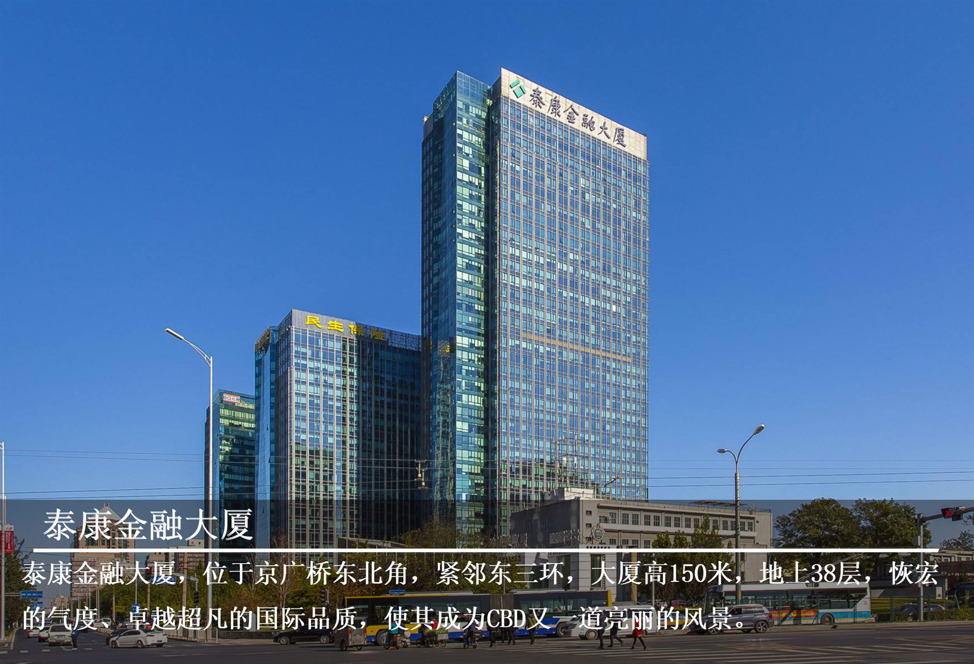 泰康金融大廈位于京廣橋東北角,緊鄰東三環(huán),大廈高150米,地上38層,地下3層,恢宏的氣度、卓越超凡的唯美典雅的藝術(shù)氛圍,使其成為CBD又一道亮麗的風(fēng)景。大廈內(nèi)設(shè)藝術(shù)主題的高檔商務(wù)會所,世界紅酒廊、高端餐廳、藝術(shù)活動空間、雪茄吧,中西合璧。