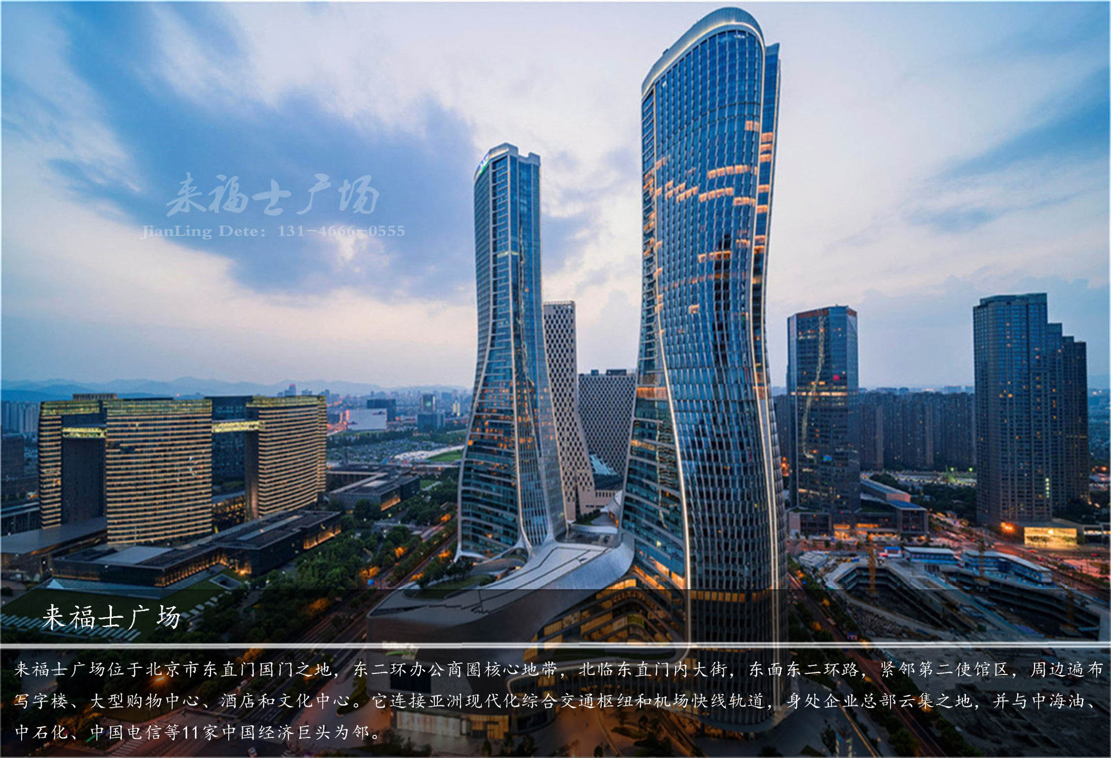 北京來(lái)福士中心位于北京市東直門國(guó)門之地,東二環(huán)辦公商圈核心地帶,北臨東直門內(nèi)大街,東面東二環(huán)路,緊鄰第二使館區(qū),周邊遍布寫字樓、大型購(gòu)物中心、酒店和文化中心。它連接亞洲現(xiàn)代化綜合交通樞紐和機(jī)場(chǎng)快線軌道,身處企業(yè)總部云集之地,并與中海油、中石化、中國(guó)電信等11家中國(guó)經(jīng)濟(jì)巨頭為鄰。憑借軌道交通及近在咫尺的東二環(huán)、機(jī)場(chǎng)高速,便捷的交通網(wǎng)絡(luò)和地理位置,北京來(lái)福士中心將會(huì)極大提升京城東北部市民的生活工作品質(zhì)。