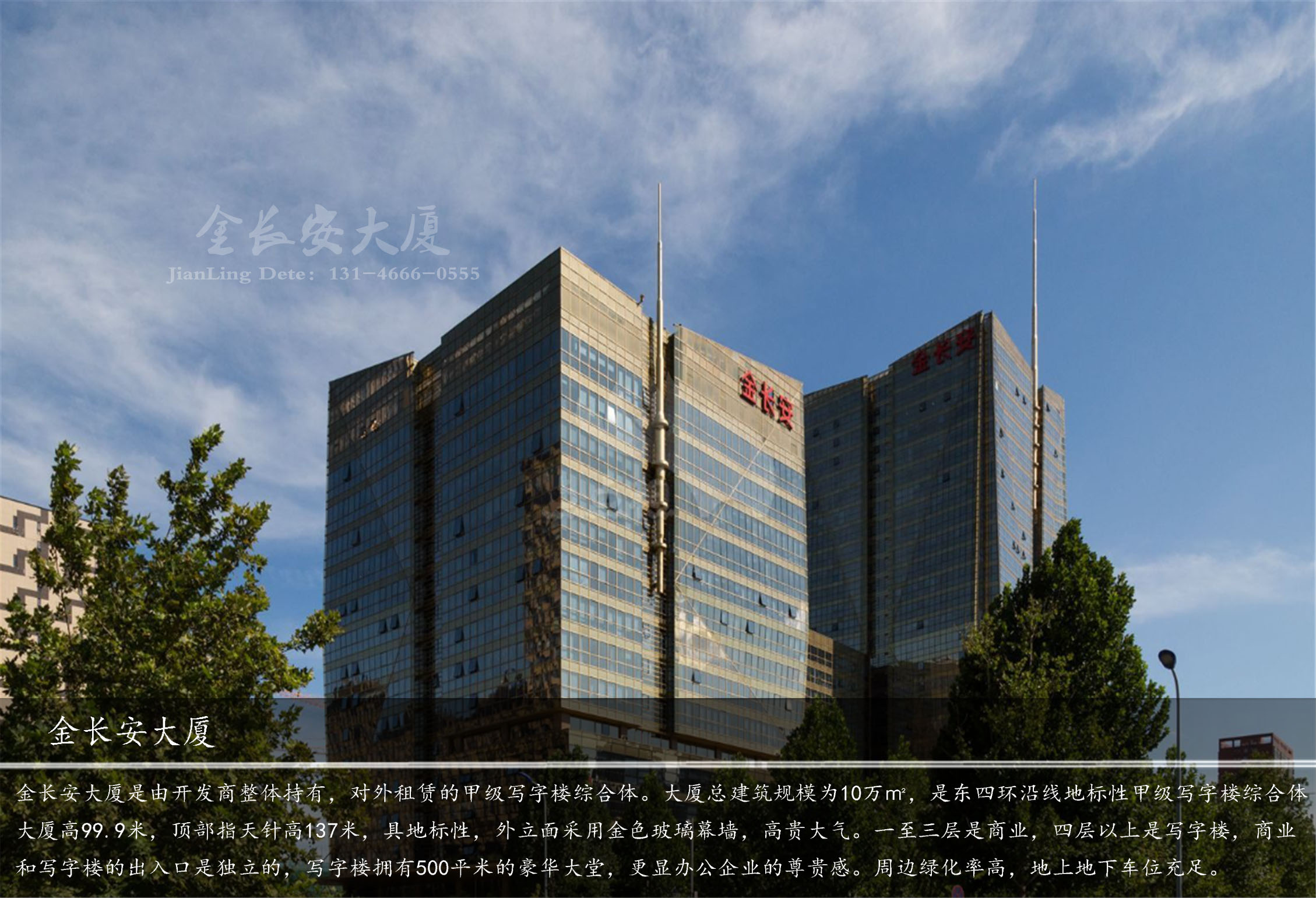 金長安大廈是由開發(fā)商整體持有,對外租賃的甲級寫字樓綜合體。大廈總建筑規(guī)模為10萬㎡,是東四環(huán)沿線地標性甲級寫字樓綜合體, 金長安大廈高99.9米,頂部指天針高137米,具地標性,外立面采用金色玻璃幕墻,高貴大氣。一至三層是商業(yè),四層以上是寫字樓,商業(yè)和寫字樓的出入口是獨立的,寫字樓擁有500平米的豪華大堂,更顯辦公企業(yè)的尊貴感。周邊綠化率高,地上地下車位充足。電梯配比率1:2。開發(fā)商自持產(chǎn)權(quán),真正的達到租前租后一條龍的優(yōu)質(zhì)服務。車位配置地上100個、地下800個 。